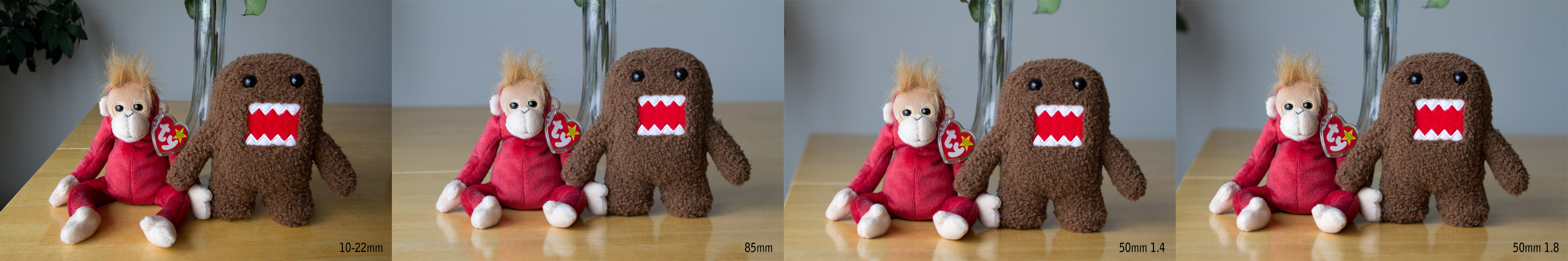 I shot a picture of monkey and domokun with each lens with similar iso and f-stop settings.